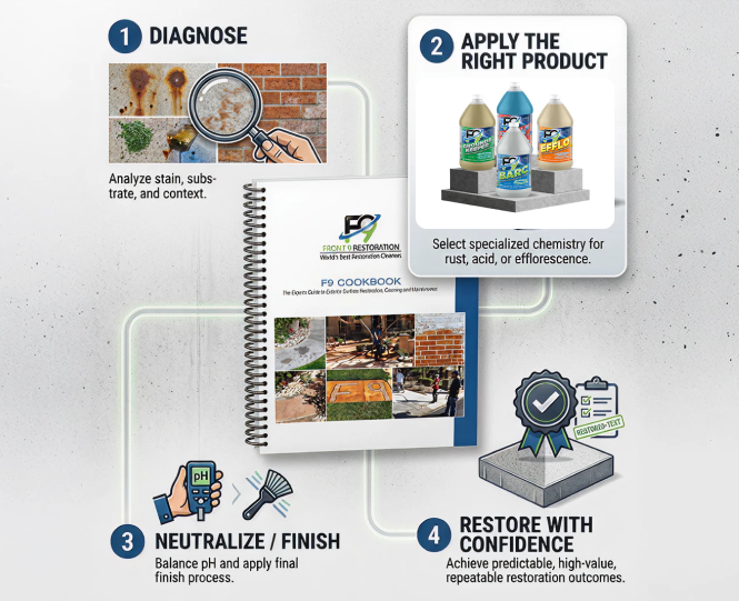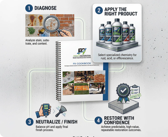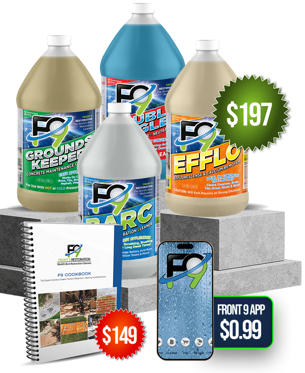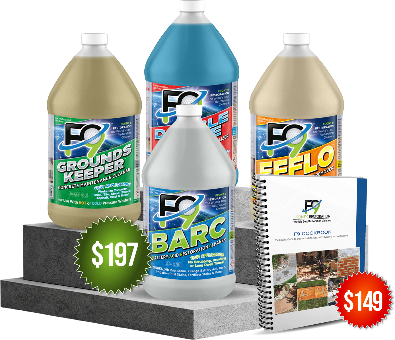 The F9 Starter Kit gives contractors the chemistry to handle the hard stain problems standard cleaning methods often leave behind. From rust and fertilizer staining to orange battery acid, calcium, grease, and tire marks, this kit helps you solve the jobs that usually turn into frustration, callbacks, or missed revenue.