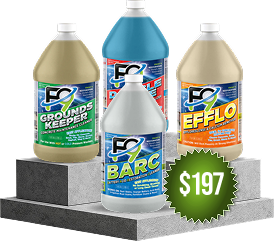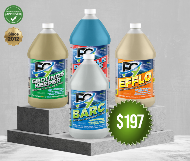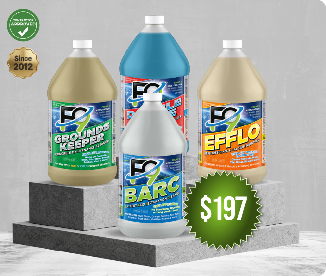 This is not one bottle trying to do everything. The F9 Starter Kit gives you four specialized products built for different restoration problems. Barc handles rust, fertilizer, and orange battery acid. Double Eagle tackles grease, oil, hydrocarbons, and tire marks. Efflo handles calcium, mineral, and efflorescence staining. Groundskeeper helps finish strong with maintenance cleaning that makes concrete pop.