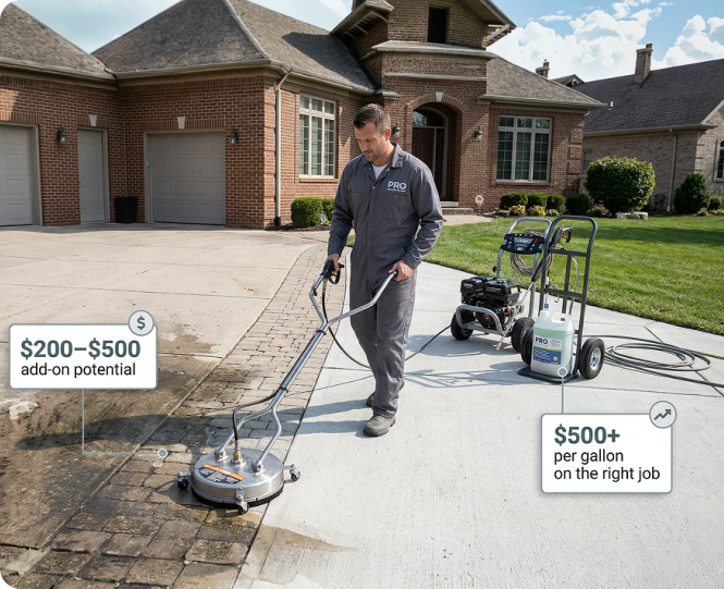 By offering specialized restoration services that pressure washing cannot match. Charge premium pricing for difficult stain removal on commercial concrete, parking garages, and high-end residential properties. Faster completion of difficult jobs means more turnover per day. Solve problems others leave behind to grow your business.