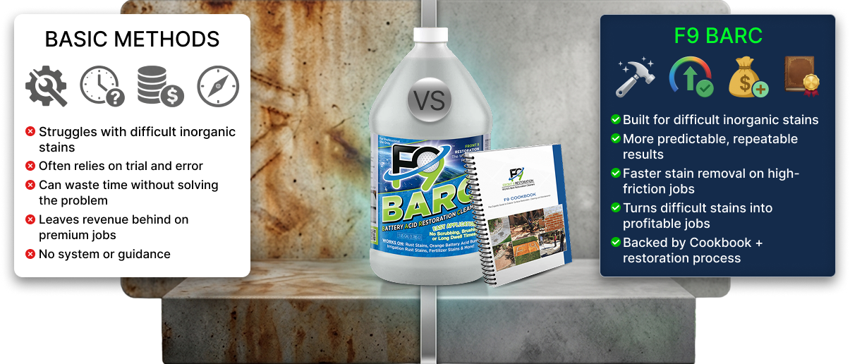 No guesswork with F9 Products. While basic acids exist, our professional restoration system provides predictable results on difficult stains (rust, battery acid, fertilizer) without damage, using greener acids. F9 Barc turns unworkable stains into profitable jobs, paying for itself repeatedly per use and being far less risky than replacing your high-profit restoration services.