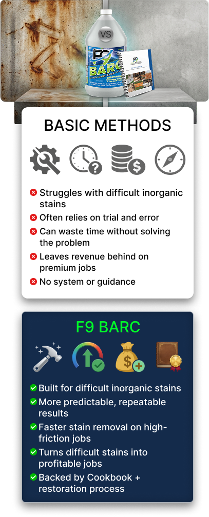 From solving difficult stains to creating higher-value jobs, F9 Barc helps contractors work faster, smarter, and with more confidence.